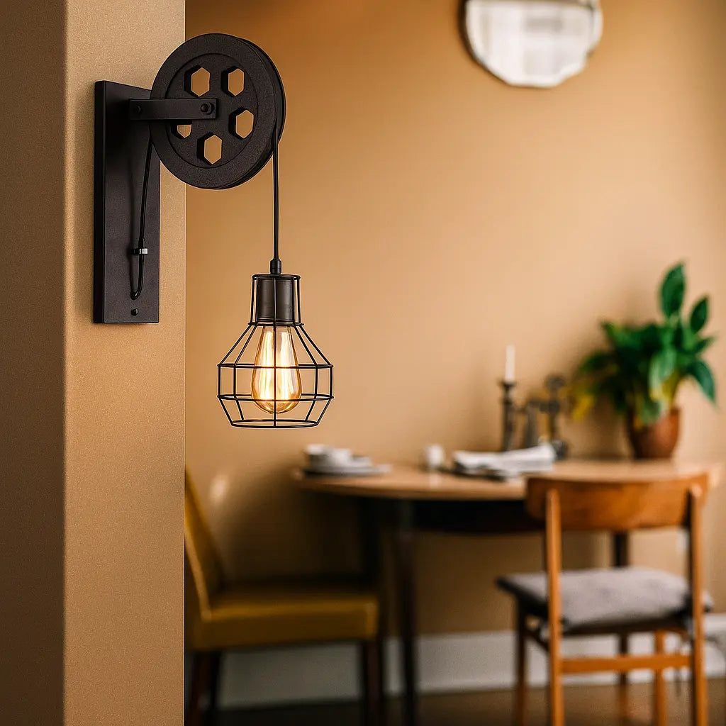 Avec sa poulie décorative et sa cage en métal, cette applique murale transforme votre intérieur en un espace au style loft affirmé. Son design équilibré mêle sobriété et caractère, idéal pour réchauffer une salle à manger ou un salon.